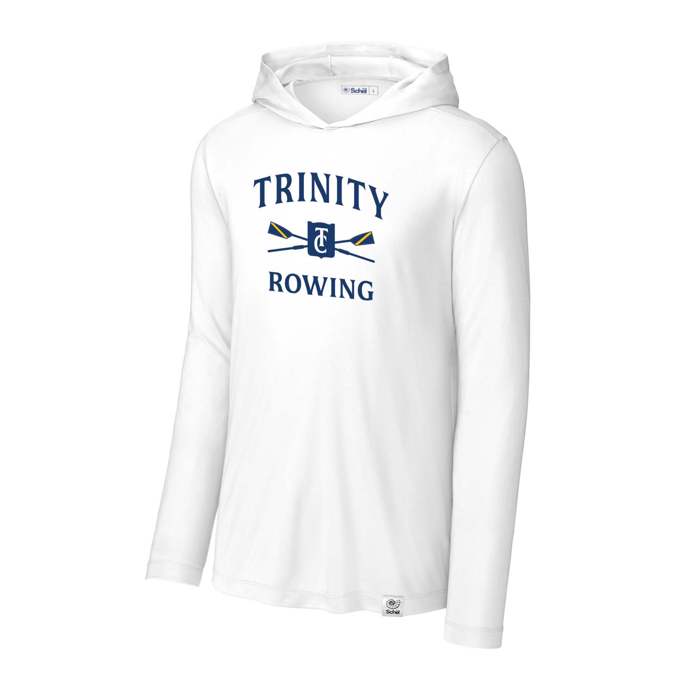 We have a limited supply of our lightweight UV hoodie in Navy and White with a classic “Trinity Rowing” graphic.
